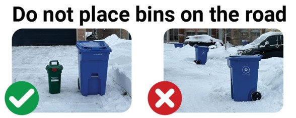 Please place your garbage, recycling and green bins in a visible location at the end of your driveway and NOT on the roadway, sidewalk, or snowbank.