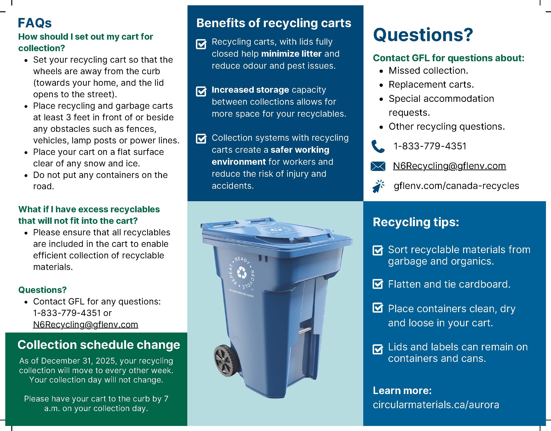 Effective December 31, 2025: Blue box collection will be collected by Green For Life (GFL) and managed by Circular Materials, a non-profit representing producers. Collection days are expected to remain the same, but accepted materials may change.